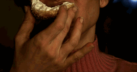 影片一上来,在恢弘的背景音乐中,母亲的特写——她正在吃奶油蛋糕,在咀嚼起伏的皱纹下,吃得嘴角到处都是奶油。