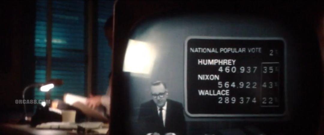 比如,电影的关键节点,在警察局里,电视上播出的,尼克松竞选获胜的直播。