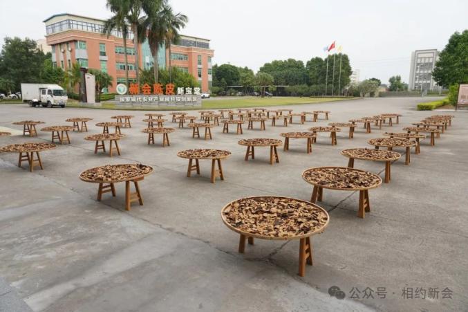 在江门市新会区新宝堂陈皮有限公司的新会陈皮晾晒场,栏目组亲眼看见了陈皮晾晒的壮观场景。数百个圆簸箕整齐排列,上面铺满了金黄色的陈皮,在阳光下熠熠生辉。