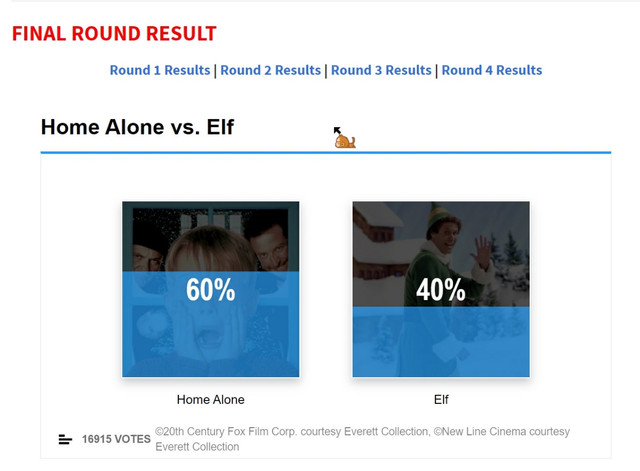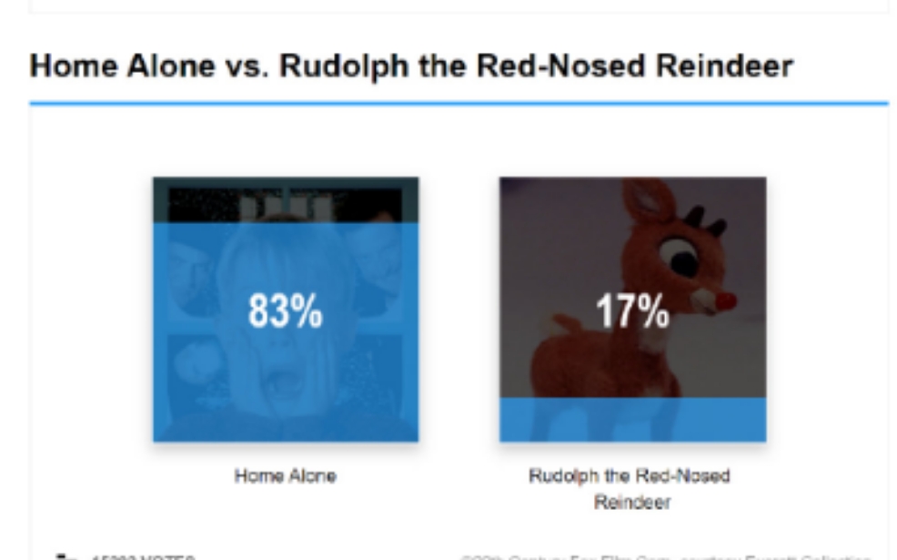 据悉,《小鬼当家》的夺冠经过了五轮的观众票选,其中,《小鬼当家》以83%的优势压倒1964年上映的《红鼻子驯鹿鲁道夫》,以同样的优势压倒1994年上映的《圣诞老人》。