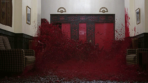 三、当然还有影片中这个最为人称道的牛掰蒙太奇——女童凶杀现场和血浆涌入的大门。插句题外话,其实按照影片逻辑,这里的血浆并不是血浆,而是红朗姆酒,对应的是上边提到过的,danny一边在口中默念red rum,一边将单词写在门上,妈妈恰巧从镜子里的倒像里看到了murder(谋杀)。“闪灵”聪明地用这种种巧合达到了提示妈妈的效果。