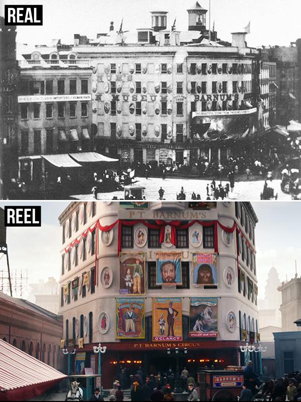 上图为历史上真实的巴纳姆博物馆,下图为电影中的博物馆