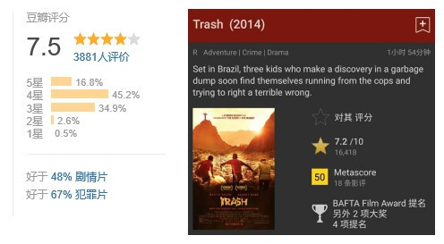 《垃圾男孩》豆瓣评分7.5分,imdb评分7.2。