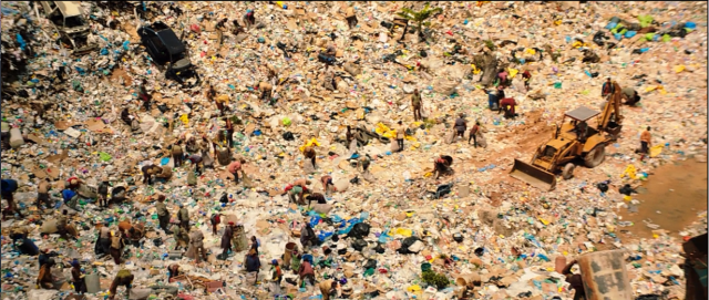 导演通过广角镜头呈现了垃圾场。那里垃圾堆积成山,透过镜头仿佛能感受到满天弥漫的恶臭和到处飞舞的蚊虫。
